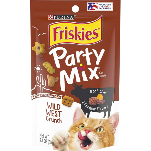 Friskies Party Mix Wild West Crunch Treats combine beef, liver and cheddar flavors for a wild mix your cat will love! With fun shapes and designs, this Party Mix Wild West Crunch Treat leaves other treats in the dust!