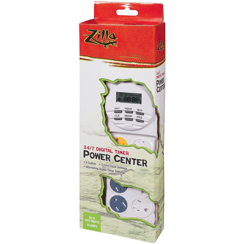 The Zilla 24/7 Digital Timer Power Center replaces the mess of wires and timers behind your reptile terrarium with one simple unit! It features 8 outlets, 7 time cycle settings, alternating digital timer settings, and an LCD screen for easy control of all your programmable devices.