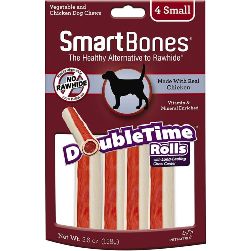 SmartBones DoubleTime Roll Chews for Dogs - Chicken - Small - 4 Pack - (5" Long - For Dogs 11-25 lbs)SmartBones Large DoubleTime Rolls Chicken Chews for Dogs are the healthy, rawhide-free chewing option your dog has been craving! These delicious treats are made with real chicken and nutritious vegetables for an easily digestible, super satisfying chew your pooch will love. A chewy chicken surprise waits in the center to reward your dog for doing what he does best!